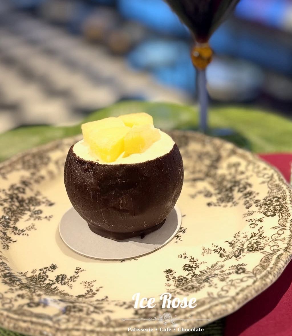 Çikolatalı dondurma, süt ve buz ile hazırlanıp servis edilir.